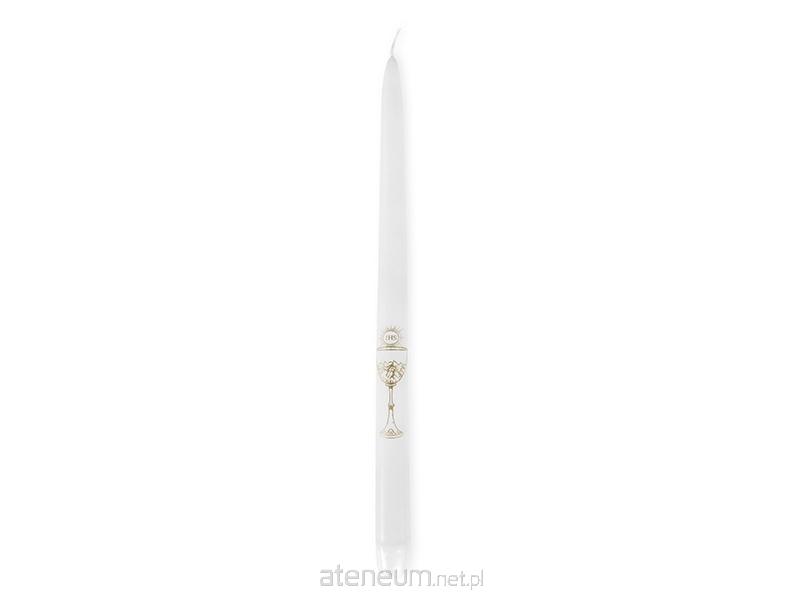 Świece komunijne w kolorze białym ze złotym emblematem w kształcie kielicha, wysokość 29 cm. Zestaw zawiera 4 świece. Czas palenia: 8 godzin.(1 op. / 4 szt.)