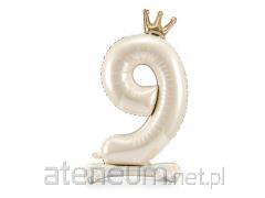 Stojący balon foliowy cyfra ''6'' w kolorze jasnokremowym z satynowym wykończeniem i koroną w kolorze złotym, rozmiar przed napompowaniem 103 cm (40.5''), rozmiar po napompowaniu 84 cm (33''). Do napompowania powietrzem. W zestawie dołączona jest słomka