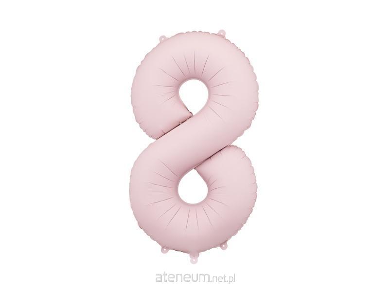 Balon foliowy matowy Cyfra 8 w kolorze jasnoróżowym, rozmiar przed napompowaniem ok. 100 cm (39''), rozmiar po napompowaniu ok. 86 cm (34''). Do napompowania powietrzem i helem. Zestaw zawiera słomkę. Balon jest samouszczelniający się. Posiada haczyki ułatwiające montaż balona do dekoracji.