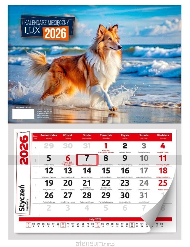 Kalendarz ścienny, miesięczny z okienkiem; 12 kart. Główki wypukłe 2 wzory. Wymiary po rozłożeniu 295x400 mm.