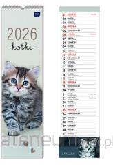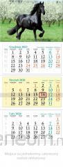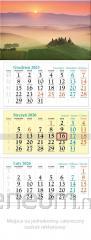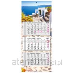 Kalendarz ścienny, trzymiesięczny z okienkiem; 12 kart. Główki wypukłe 2 wzory. Wymiary po rozłożeniu 200x775 mm.