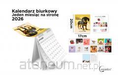 "Kalendarz biurkowy typu namiot, kalendarium w układzie miesięcznym, 56 stron + okładka. Na spirali, papier w środku kreda mat. Wymiary 185x182 mm"