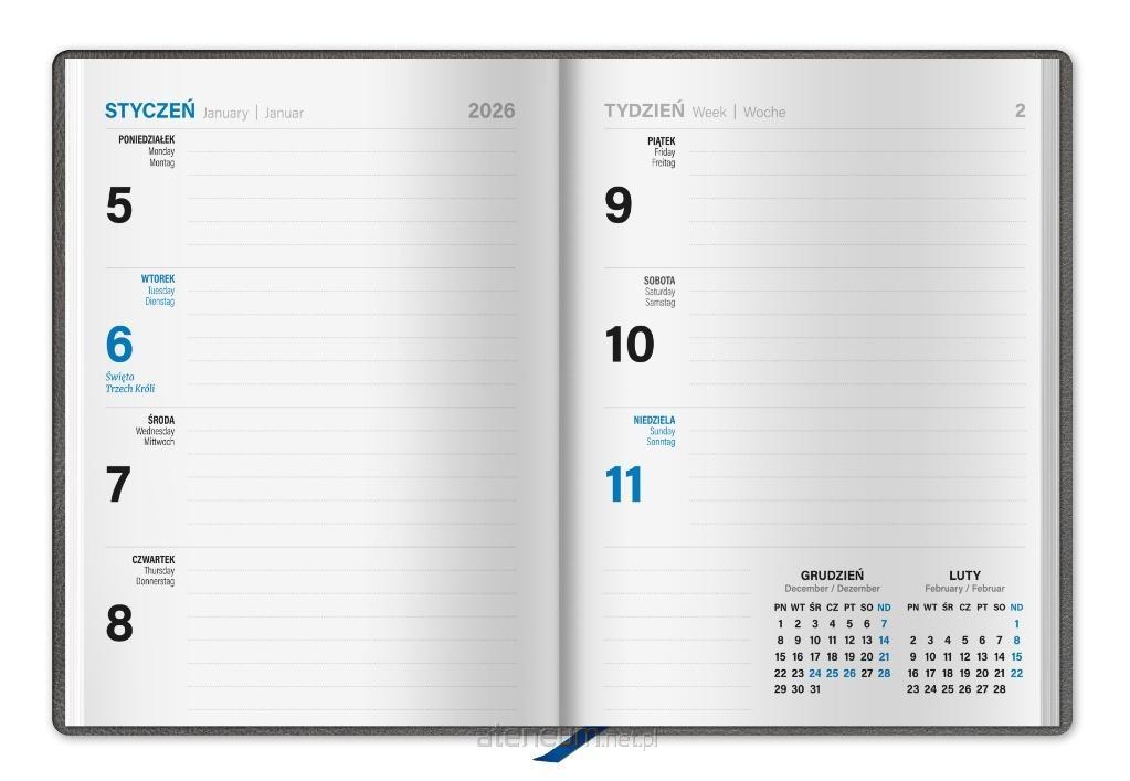 Kalendarz książkowy w twardej oprawie ze wstążką. Układ kalendarium tygodniowy. 128 stron. Wymiary 115x155 mm