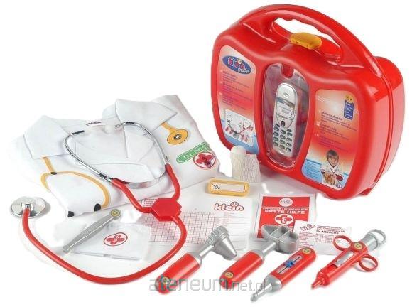 Walizka lekarska Deluxe jest najbardziej okazałym i kompletnym zestawem całej serii lekarskiej. Zawiera on kompletne i niezbędne wyposażenie każdego medyka. Czerwona walizeczka wykonana jest z bardzo trwałego tworzywa, posiada wygodny uchwyt do noszenia oraz żółty klips, który zabezpiecza ją przed otwieraniem się. Z przodu pod transparentną pokrywą znajduje się zabawkowy telefon komórkowy, który musi zawsze być pod ręką. Ten zestaw zawiera aż 15 elementów. Wszystkie elementy są oczywiście bezpieczne dla dzieci i proste w użyciu. W walizeczce znajdują się metalowy stetoskop, materiałowy fartuch lekarski z krótkim rękawem (rozmiar uniwersalny 92-134), zabawkowy telefon komórkowy (wymagane użycie baterii, których brak jest w zestawie), strzykawka, termometr, nożyczki, otoskop, młoteczek, penseta, plaster, identyfikator, opaska pielęgniarska, pudełeczko na watę opatrunkową, recepta, karta pomiarów medycznych. Bardzo ważne jest, że tylko w tym zestawie znajduje się prawdziwy, działający, metalowy stetoskop dla dzieci oraz fantastyczny fartuch lekarski w uniwersalnym rozmiarze. Wszystkie elementy są oczywiście bezpieczne dla dzieci i proste w użyciu. Seria zestawów i akcesoriów lekarskich z jednej strony służy zabawie w doktora czy pielęgniarkę, a z drugiej strony pomaga dzieciom oswoić się z tematem wizyty u lekarza, wykonywanych badań i zabiegów. Mamy tutaj szeroki wybór zestawów z większą lub mniejszą ilością akcesoriów oraz szereg pojedynczych produktów jak np. fartuchy lekarskie czy stetoskopy. Cała seria wizualnie stworzona jest tak, aby mogli się nią bawić zarówno chłopcy jak i dziewczynki.