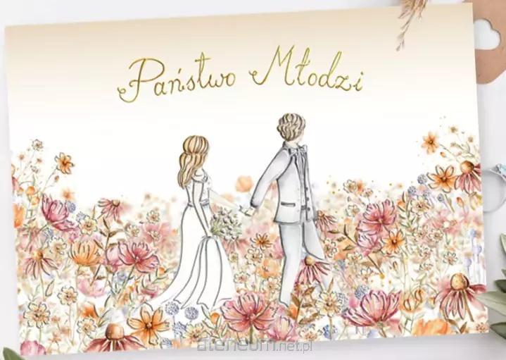 Karne w formacie A5, złocony i tłoczony, teksy życzeń w środku. Wydrukowany na wysokiej jakości papierze. W zestawie koperta.