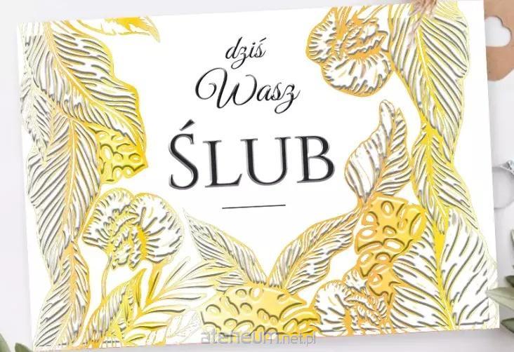 Karne w formacie A5, złocony i tłoczony, teksy życzeń w środku. Wydrukowany na wysokiej jakości papierze. W zestawie koperta.