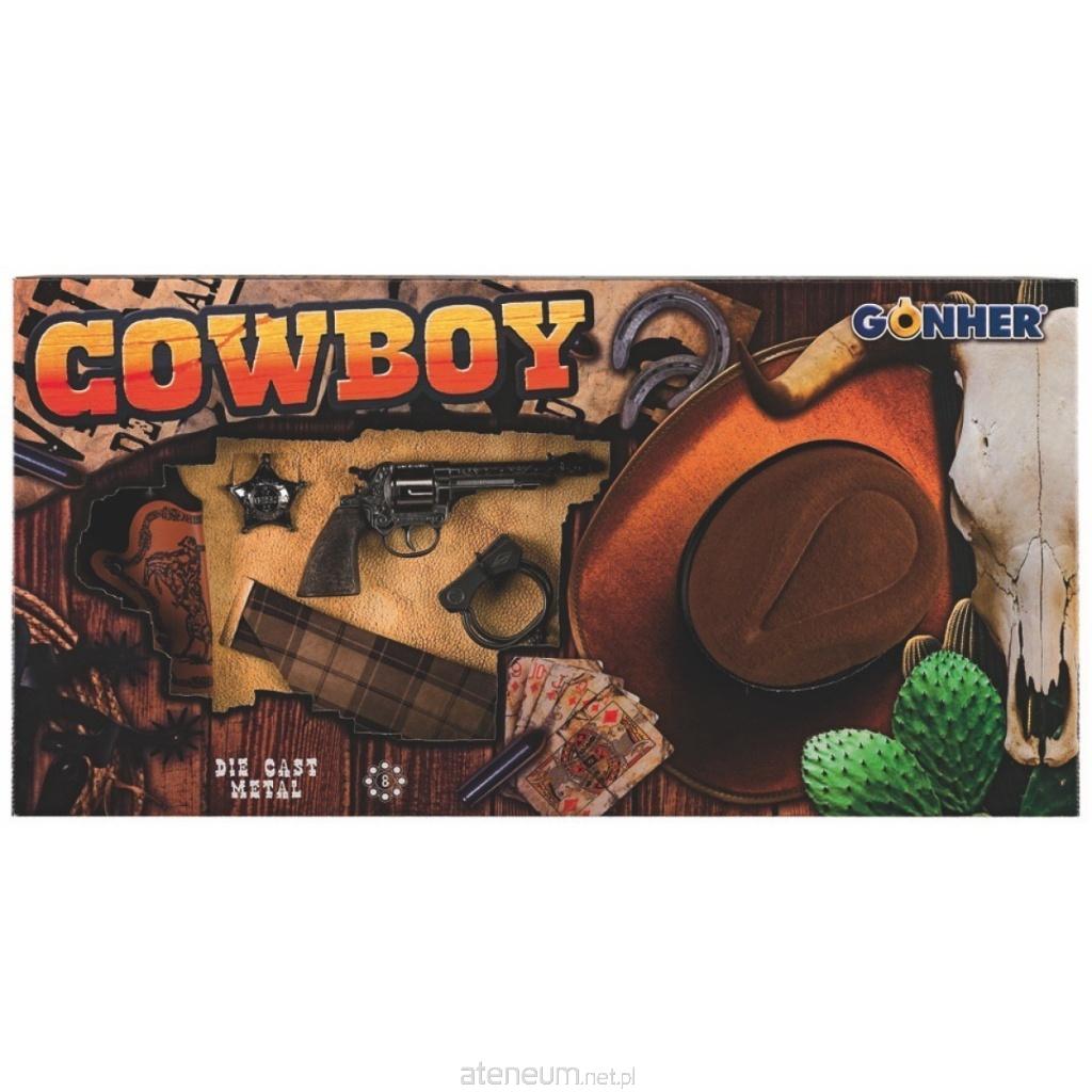 Zestaw zawiera: metalowy rewolwer na 8 naboi z bębenkiem, kaburę, kapelusz kowboja, chustę, pasek, kajdanki oraz odznakę. Wiek: 3+. Szt./karton: 6