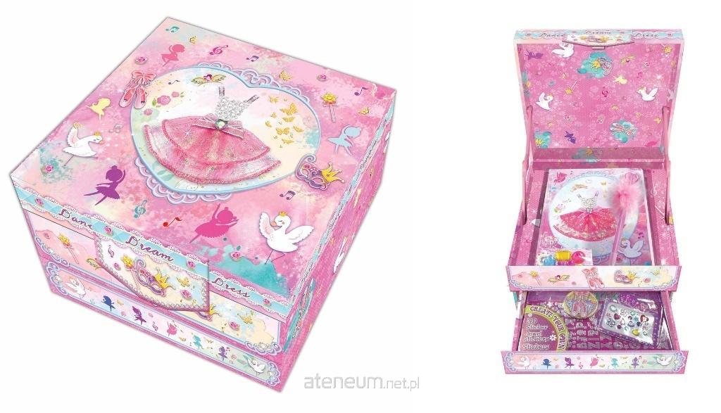 Zestaw zawiera: - pamiętnik - ozdobny długopis - kryształki samoprzylepne - naklejka 3D - arkusz naklejek Zestaw zapakowany w kartonowe pudełko ze zdobieniami zamykane na magnes. Po otwarciu wysuwają się 2 szufladki, w których można umieścić akcesoria i dodatkowe drobiazgi. Wiek: 6+
