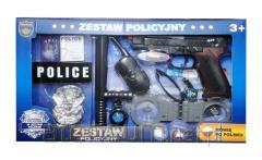 Zabawka z dźwiękami strzelania, przeładowania broni oraz komendami policyjnymi w języku polskim: `Do wszystkich jednostek: Zgłaszam napad, ruszajmy do akcji`, `Policja! Ręce do góry`, `Stój, bo będę strzelał`, `Poddaj się, rzuć broń! Jesteś otoczony`, `Jesteś aresztowany, jedziemy na komendę`. Pistolet w zestawie z imitacją skórzanej kabury. Produkt działa na baterie typu AG10. Baterie znajdują się w zabawce. Zabawka zapakowana w kartonowe opakowanie. Produkt dla dzieci od 3 lat.