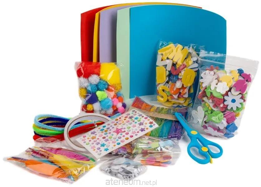 duży zestaw kreatywny, zawiera twardy papier, nożyczki, taśmę dwustronną, pompony, piórka, piórka, drewka, guziki, druciki, naklejki piankowe - litery, kwiaty, zwierzęta, samoprzylepne ruchome oczka, samoprzylepne diamenciki, cekiny