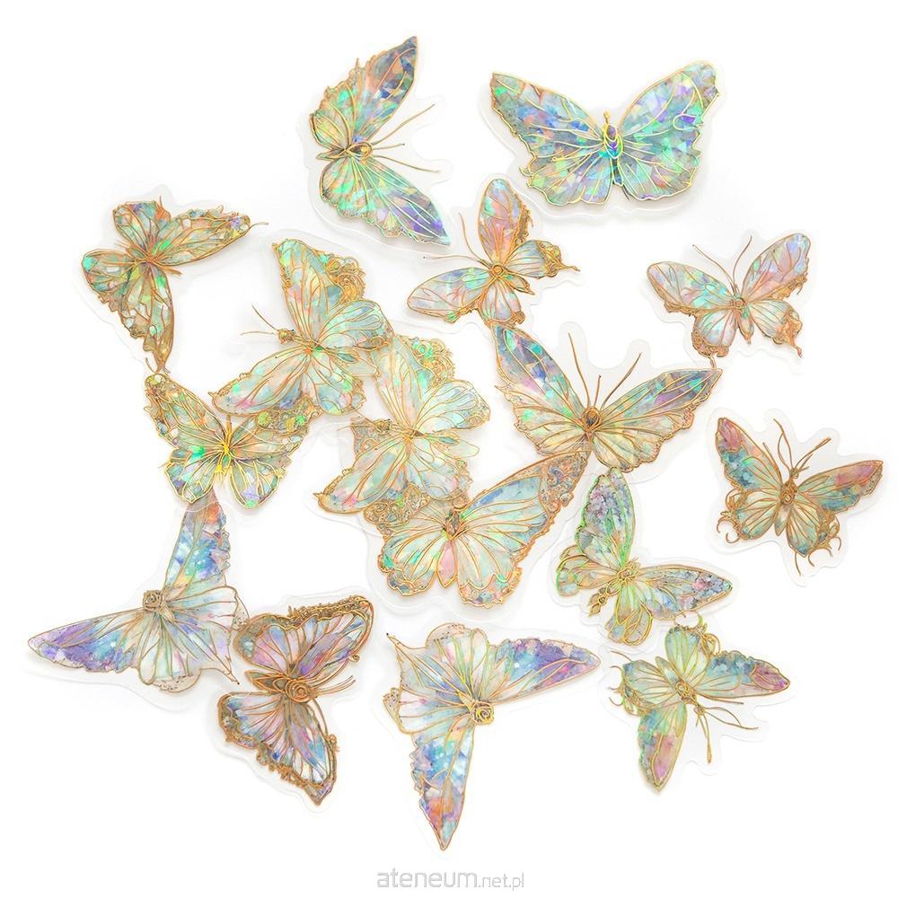 Naklejki z wysokiej jakości transparentnej folii PET z motywami motyli w tęczowych odcieniach z mieniącym się efektem dla osób szukających eleganckich i trwałych ozdób.