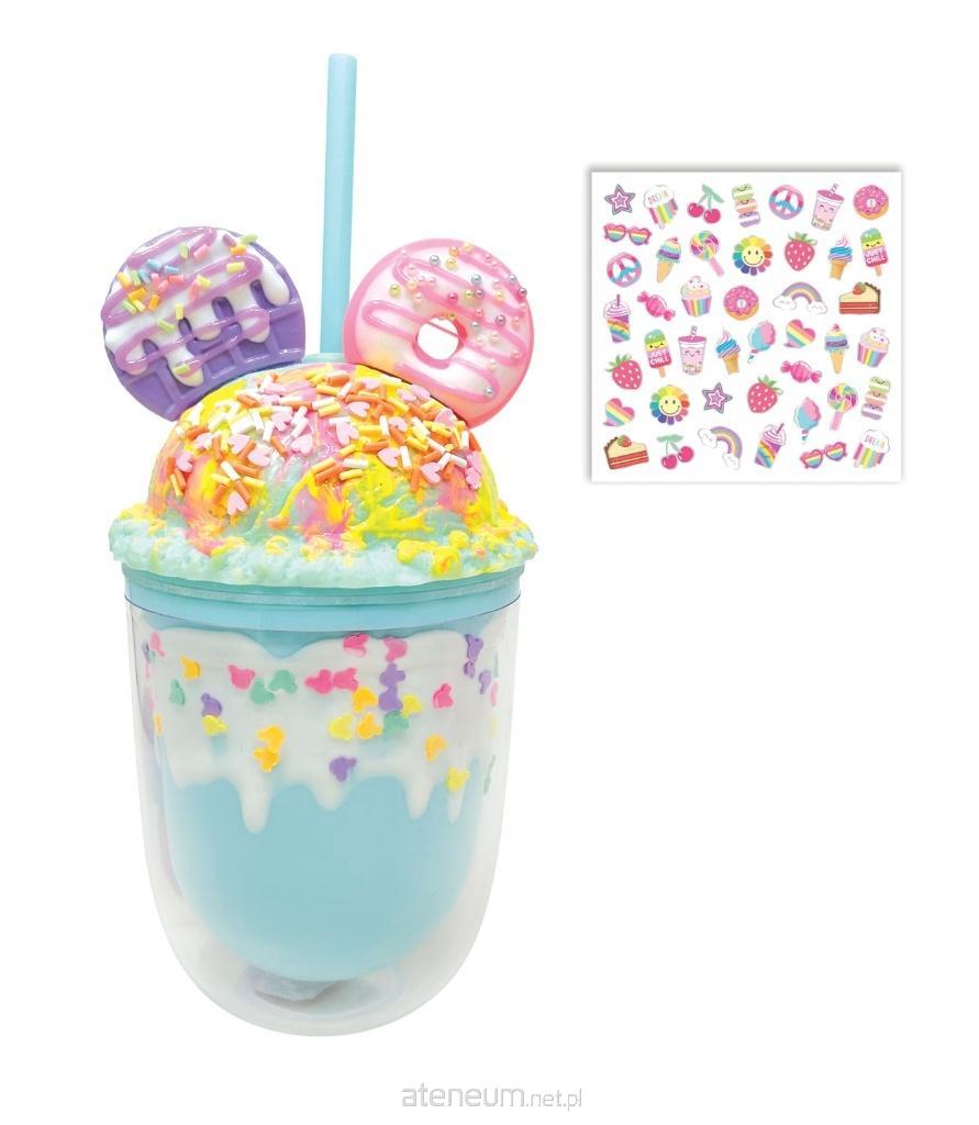 Kubek o pojemności 350ml wykonany z grubego plastiku, z podwójną ścianką dla dodatkowej ochrony. Zakręcany wypukłą nakrętką z ozdobami dzięki czemu napój się z niego nie wyleje. Pod ścianką umieszczono kolorowe koraliki dla dodatkowego dekoracyjnego efektu. Do kubka dołączona jest wielorazowa słomka oraz arkusz naklejek świecących w ciemności. Wiek: 5+