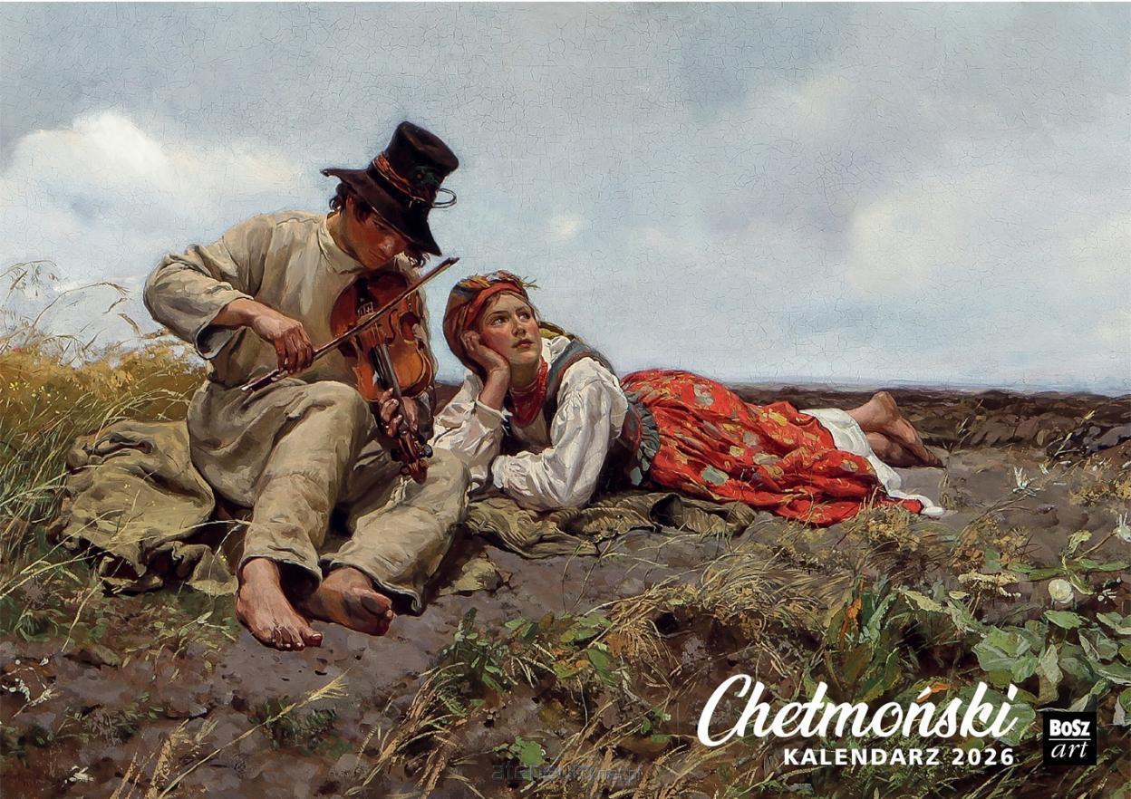 Kalendarz 13-kartkowy na 2026 rok z ilustracjami obrazów Józefa Chełmońskiego w formacie A3 (420x297 mm) wydrukowany na kredowym papierze o gramaturze 170 g.
