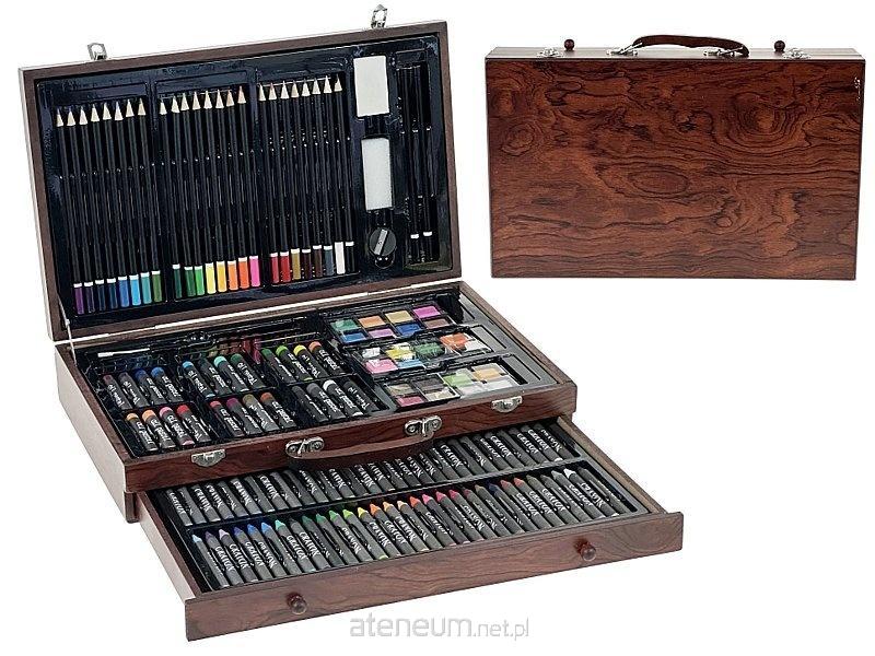 Duży zestaw artystyczny do malowania i rysowania, 143 elementy - kredki (świecowe, pastelowe, ołówkowe), ołowki, farby, pędzle, temperówka, gąbka, 37x23x8cm, walizka