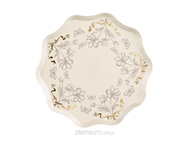 Papierowe, beżowe talerzyki z ciemnobeżowymi kwiatami i złotym błyszczącym nadrukiem. Średnica około 20 cm.(1 op. / 6 szt.)