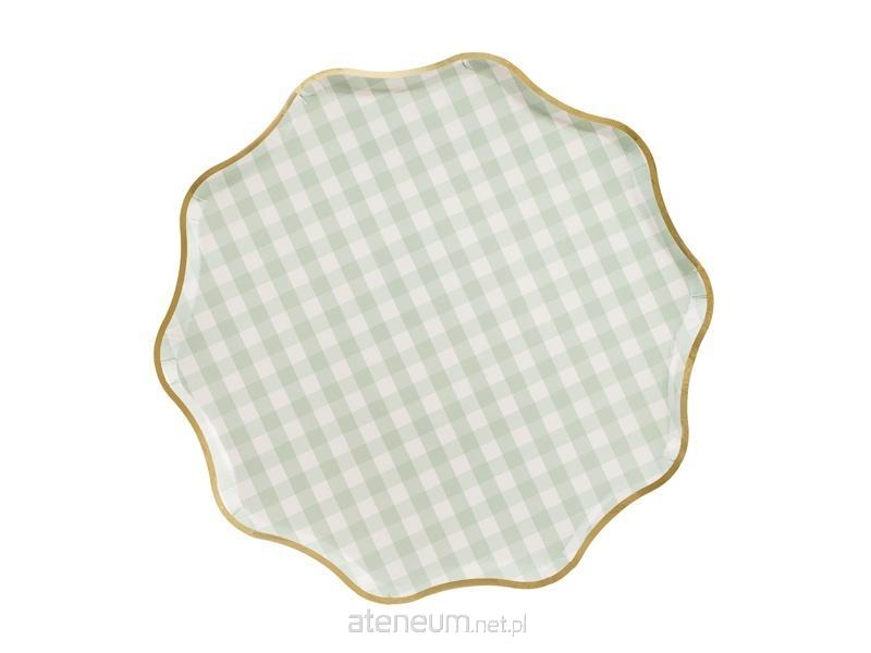 Papierowe talerzyki w zieloną kratkę ze złotym, błyszczącym brzegiem. Średnica około 23 cm.(1 op. / 6 szt.)