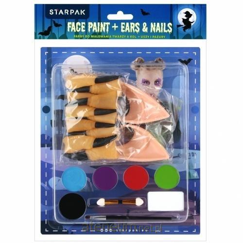Farby do malowania twarzy, ciała, 6 kolorów z akcesoria w postaci uszów oraz pazurów STARPAK. Farby w 6 kolorach: niebieskim, fioletowy, czerwonym, zielonym, czarnym oraz białym, farby łatwo zmywalne, bezpieczne (przed użyciem zapoznaj się z opisem produktu znajdującym się na opakowaniu!).Dzięki temu zestawowi kreatywność dziecka nie zna granic! Każda farbka zapakowana w osobnym pojemniczku, mały podwójny aplikator do malowania oraz mały pędzelek z pewnością spełnią oczekiwania. Zawartość zestawu: 6 kolorów farb do malowania twarzy, 1 x pędzelek, 1 x aplikator do malowania, uszy gumowe, pazury czarownicy .