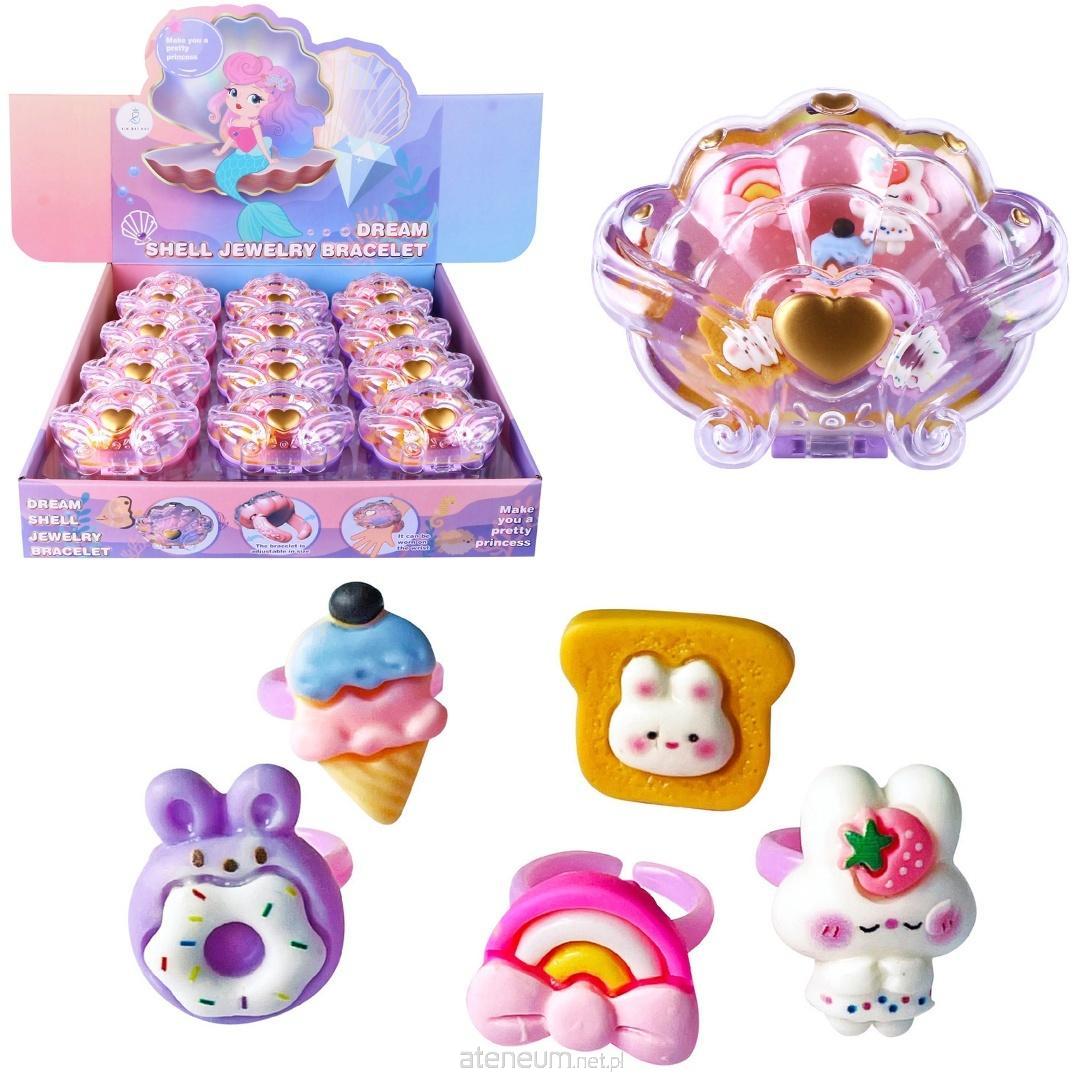Bransoletka "Dream Shell Jewelry Bracelet" z Uroczymi Pierścionkami - W Kształcie Muszli! Opis produktu: Spełnij marzenia o byciu małą księżniczką dzięki tej uroczej bransoletce "Dream Shell Jewelry Bracelet"! Bransoletka po otwarciu staje się szkatułką z wesołymi pierścionkami. To idealna propozycja dla każdej dziewczynki, która uwielbia biżuterię i kreatywną zabawę. Cechy produktu: Bransoletka w etui w kształcie muszli: Każda bransoletka zapakowana jest w przezroczyste, otwierane etui w kształcie muszli, ozdobione serduszkiem i drobnymi detalami, które dodają jej uroku. Muszla może służyć jako szkatułka na drobiazgi. Urocze pierścionki: Zestaw zawiera różnorodne, kolorowe pierścionki wykonane z miękkiego materiału, w kształtach takich jak: o Lody/Rożek lodowy o Królik na toście o Pączek z uszkami królika o Tęcza o Królik z truskawką o i inne słodkie motywy! Bezpieczne materiały: Wykonane z materiałów bezpiecznych dla dzieci. Przeznaczenie: Ta bransoletka to idealny dodatek dla małych elegantek, które lubią biżuterię i chcą wyrażać swój styl. Doskonale sprawdzi się jako upominek na przyjęcia, drobna nagroda lub po prostu jako element codziennej, kreatywnej zabawy. Wiek: 3 lata + Wielkość bransoletki: 10x10x8 cm