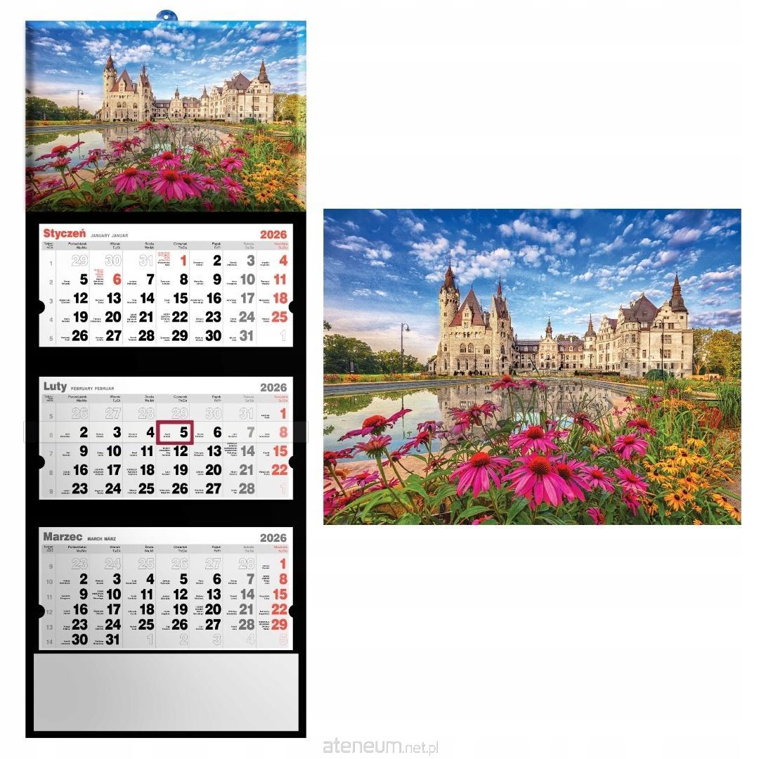 KALENDARZ TRÓJDZIELNY 2026 WYMIAR CAŁKOWITY KALENDARZA: 32 x 85,5cm GŁÓWKA KALENDARZA: Zdjęcie uszlachetniane folią błysk, z efektem wypukłości. KALENDARIUM: wym. 28,5 x 14 cm, trójjęzyczne (PL, GB, D), z numeracją tygodni i imieninami jest przytrzymywane przez kartonowe wypustki, które zapobiegają jego odstawaniu od plecków kalendarza. WYKOŃCZENIE: kartonowa zawieszka, pasek z czerwonym przesuwanym okienkiem, miejsce na notatki. WYMIAR ZDJĘCIA 32 x 22 cm ZDJĘCIE Z EFEKTEM WYPUKŁOŚCI: uszlachetnione folią błysk.