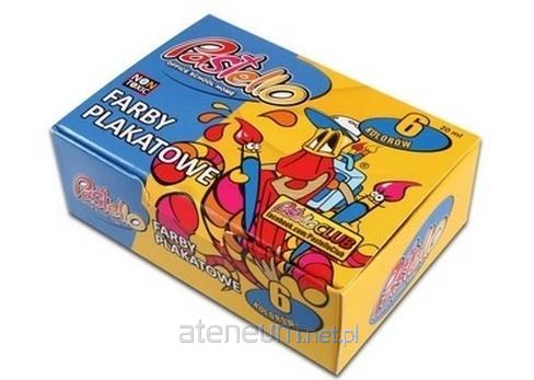 Farby plakatowe 6 kolorów. Pojemność 20 ml. Farby na bazie wody o intensywnych kolorach. Znakomitą przyczepność pozwala na malowanie takich podłoży jak: papier, karton, drewno, ceramika, kamień. Wymalowane powierzchnie po wyschnięciu są matowe o intensywnych barwach, odporne na działanie światła i ścieranie. Wyprodukowane w Polsce.