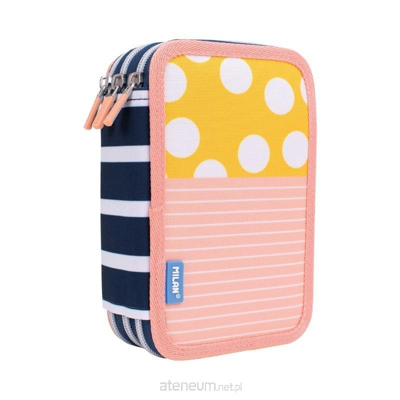 Piórnik 3 - poziomowy z wyposażeniem, który pozwala utrzymać przybory szkolne zawsze w porządku i łatwo dostępne. Kolekcja SWIMS 2 z paskami i kropkami inspirowanymi strojami kąpielowymi z lat 60. Połączenie kolorów: różowego, żółtego i granatowego. Wyposażenie: 12 kredek trójkątnych, 6 kredek metalizowanych, 18 flamastrów ze stożkową końcówką, 3 długopisy CAPSULE: czarny, czerwony i zielony; ołówek drewniany HB, 5 zakreślaczy FLUO JUNIOR, linijka trójkątna 15 cm, temperówka kwadratowa AFILA, nożyczki BASIC, gumka 4024. Każdy poziom osobno zapinany na suwak. Przy produkcji piórników użyto najlepszych materiałów, bardzo wytrzymałych suwaków oraz wzmocnionych nici. Niepowtarzalne wzornictwo. Materiał zewnętrzny i wewnętrzny 100% poliester. Rozmiar piórnika: 19,5 x 13 x 7,5 cm. W piórnikach znajdziesz min.: kredki MILAN przy produkcji których użyto drewna pochodzącego wyłącznie z plantacji, gwarantujących nieużywanie drewna z lasów deszczowych. Rysik kredki na całej długości jest przyklejony do drewna co zapobiega jego łamaniu. Dzięki trójkątnej budowie kredka jest ergonomiczna i wygodnie trzyma się dziecku. Flamastry MILAN posiadają wytrzymałą i elastyczną stożkową końcówką, która nie wpada do środka nawet przy silnym nacisku. Po chwilowym odkształceniu końcówka zawsze wraca do pierwotnego kształtu. Tusz na bazie wody. Flamastry nie zawierają ftalanów, metali ciężkich i innych. Temperówkę z bezpiecznym przykręconym ostrzem dzięki czemu ostrze nie oddzieli się od obudowy temperówki. Gumkę z naturalnym kauczukiem.