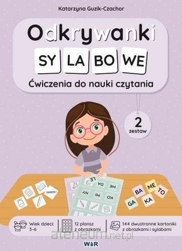 Odkrywanki sylabowe. Ćwiczenia do nauki czytania. Zestaw 2 to pomoc wspierająca naukę czytania metodą sylabową, połączona z ćwiczeniami rozwijającymi percepcję wzrokową, analizę sekwencyjną i motorykę małą. Dzięki atrakcyjnej formie i elementowi zabawy dziecko chętnie angażuje się w naukę, a czytanie staje się przyjemnością. Zestaw opiera się na słowach składających się z sylab otwartych zbudowanych ze spółgłosek: P, M, B, L, F, W, T, D, K, G, J, N. Zestaw zawiera ćwiczenia identyfikowania czarno-białych obrazków tematycznych i atematycznych (i ich konturów). Pomoc dedykowana jest: nauczycielom przedszkolnym i wczesnoszkolnym, terapeutom i logopedom pracującym z dziećmi z trudnościami w nauce czytania, rodzicom wspierającym dzieci w nauce czytania metodą sylabową. Zawartość zestawu: 12 plansz z czarno-białymi obrazkami, 144 dwustronne kartoniki z obrazkami i sylabami, instrukcja z opisem ćwiczeń, kod QR do dodatkowych materiałów. Zestaw pozwala na trening: percepcji wzrokowej analizy sekwencyjnej rozpoznawania sylab motoryki małej