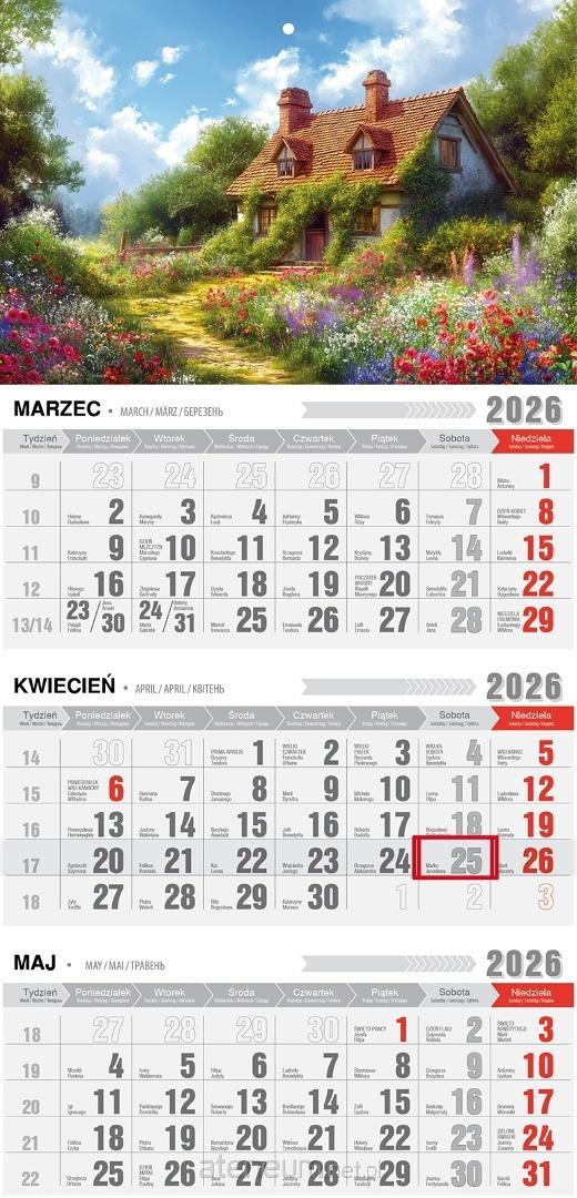 Kalendarz 2026 Trójdzielny Ekonomiczny JEDNOPLANSZOWY Z MAGNESEM oraz przesuwnym okienkiem. Format 300/623mm. Kalendaria w języku PL, EN, DE i UA. Główka z otworem wierconym oraz magnesem to doskonała propozycja do przyczepienia na lodówkę. Dodatkowo nazwy miesiąca i dni tygodnia w języku Ukraińskim, Angielskim i Niemieckim. Kalendarium dodatkowo zawiera fazy księżyca i znaki zodiaku. Dużo miejsca do notowania, czytelne duże litery i cyfry. 12 kart do zrywania.