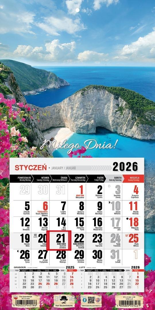 Kalendarz 2026 Trójdzielny JEDNODZIELNY MINI Z MAGNESEM. Format 230/460mm. Układ kalendariów jednodzielny z przesuwnym okienkiem. Główka z otworem wierconym oraz magnesem to doskonała propozycja do przyczepienia na lodówkę. Dodatkowo nazwy miesiąca i dni tygodnia w języku Ukraińskim, Angielskim i Niemieckim. Kalendarium dodatkowo zawiera fazy księżyca i znaki zodiaku. Dużo miejsca do notowania, czytelne duże litery i cyfry.