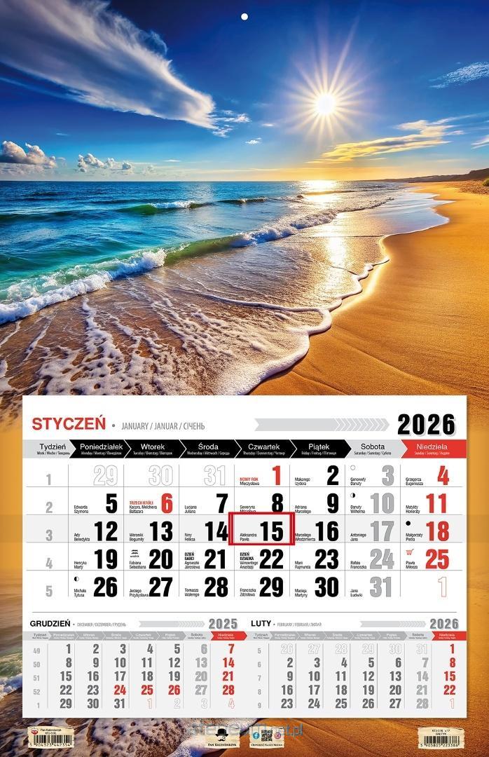 Kalendarz 2026 Trójdzielny JEDNODZIELNY 3XL. Format 440/680mm. Układ kalendariów jednodzielny z przesuwnym okienkiem. Główka z otworem wierconym. Dodatkowo nazwy miesiąca i dni tygodnia w języku Ukraińskim, Angielskim i Niemieckim. Kalendarium dodatkowo zawiera fazy księżyca i znaki zodiaku. BARDZO DUŻE I CZYTELNE KALENDARIUM, BARDZO PRAKTYCZNY DLA OSÓB SŁABO WIDZĄCYCH LUB CENIĄCYCH SOBIE KOMFORT WZROKOWY. Dużo miejsca do notowania, czytelne duże litery i cyfry. Idealny do wszystkich pomieszczeń biur i mieszkań.