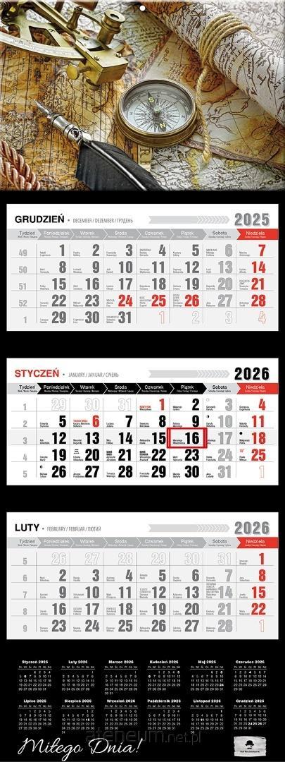 Kalendarz Trójdzielny PREMIUM Z WYPUKŁĄ GŁÓWKĄ. Format 315/810mm. Trzy komplety klasycznych kalendariów z przesuwnym okienkiem. Główka z otworem wierconym. Dodatkowo nazwy miesiąca i dni tygodnia w języku Ukraińskim, Angielskim i Niemieckim. Kalendarium dodatkowo zawiera fazy księżyca i znaki zodiaku. Dużo miejsca do notowania, czytelne duże litery i cyfry. DODATKOWO PRZEDŁUŻONE PLECKI KOLOREM DOPASOWANE DO WZORU ZE SKRÓCONYM KALENDARIUM NA ROK 2026.