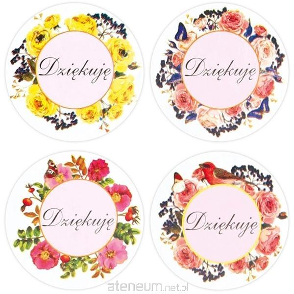 Naklejki papierowe na taśmie 8 wzorów kwiatowych z napisem Dziękuję O25mm 500szt.
