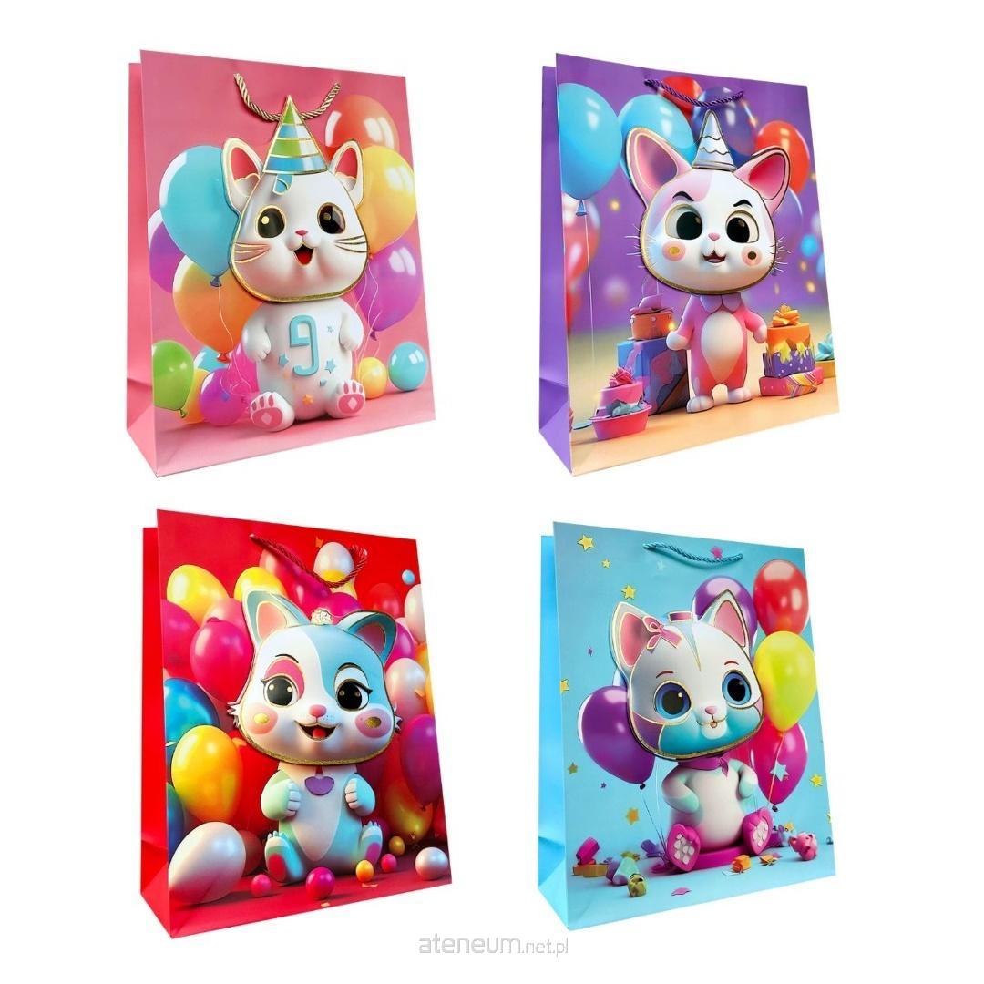 Torebka papierowa dziecięca z wizerunkiem kolorowego urodzinowego kotka wykonana z grubszego papieru o gramaturze 210 g, co zapewnia jej większą trwałość i odporność na obciążenie. Wyposażona w grubszy, kolorowy sznurek, który zapewnia wygodny uchwyt i estetyczne wykończenie. To praktyczne opakowanie, które podkreśla wartość wręczanego prezentu. Torebka posiada elementy metalizowane oraz 3D.