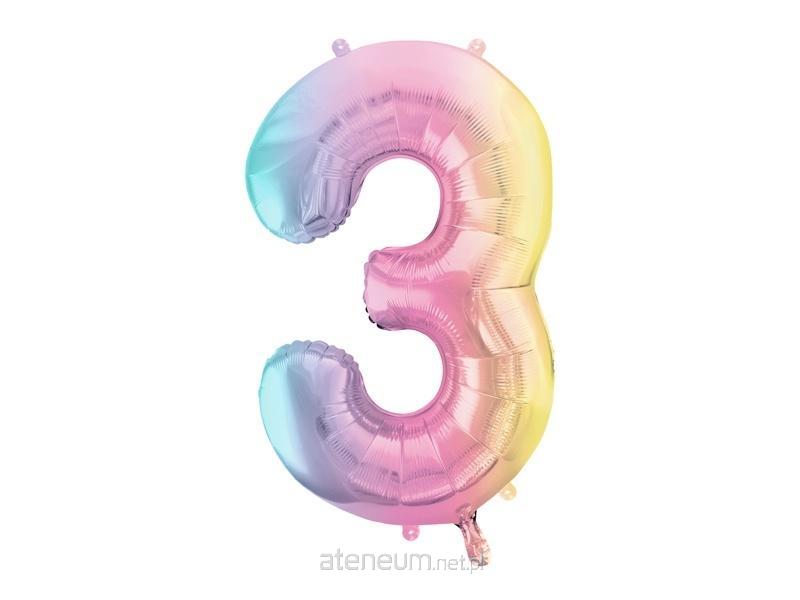 Balon foliowy Cyfra ''3'' w kolorze pastelowym tęczowym , rozmiar przed napompowaniem ok. 100 cm (39''), rozmiar po napompowaniu ok. 86 cm (34''). Do napompowania powietrzem i helem. Zestaw zawiera słomkę.