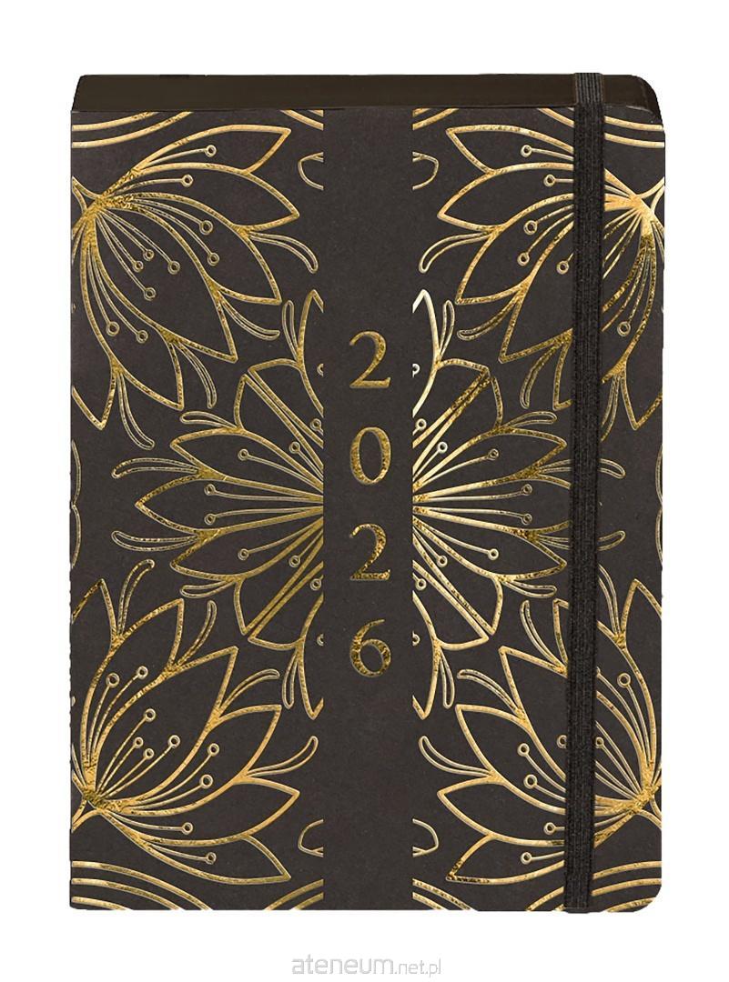 Kolekcja: Kraft, format: A5, wymiary okładki: 207x141 mm, układ: dzień na stronie, ilość stron: 352, oprawa: twarda, materiał: papier, gramatura papieru: 80g, kolor papieru: chamoise , dodatki: plan roku 2026, ważne wydarzenia, skorowidz adresowy, notatki, pionowa gumka zamykająca: czarna, wstążka: czarna, gumka na długopis: nie, zaokrąglone rogi: tak, wyklejka: czarna, koperta: nie, dostępne kolory: czarny, złoty, kwiaty