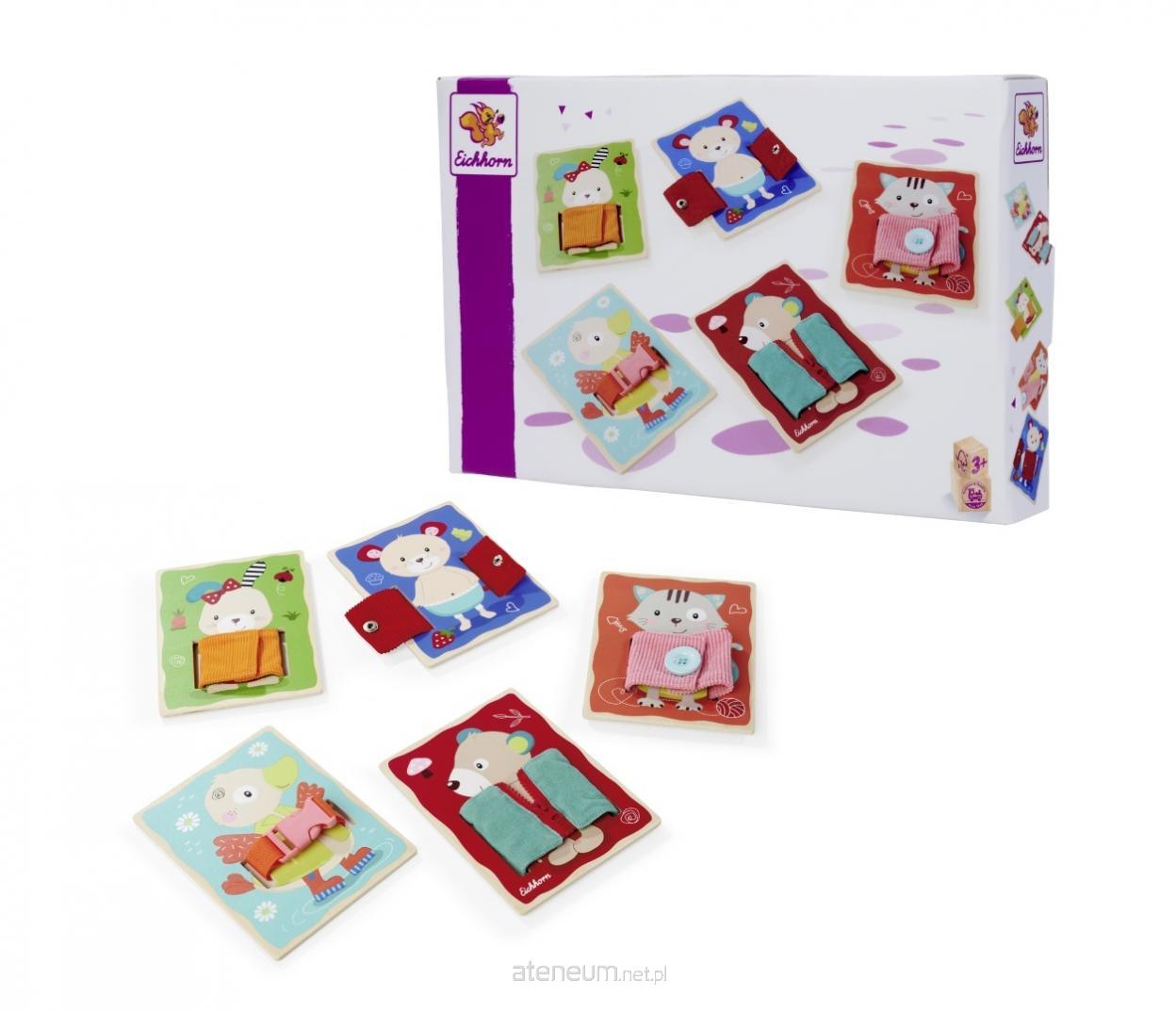 5 różnych połączeń: rzep, zamek, klips, guzik, zatrzask; 10 elementów, 18 x 14 cm, FSC® 100%, sklejka, tkanina, plastik, 3l+