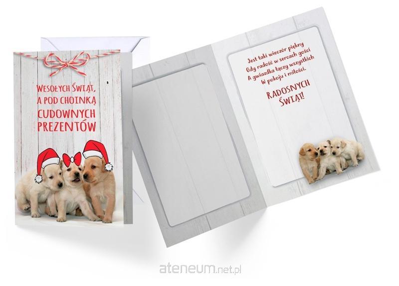 Kartka wielkości B6, zdobiona w zależności od wzoru metaliczną folią lub brokatem. Każda kartka posiada kolorowe życzenia w środku i koperte.