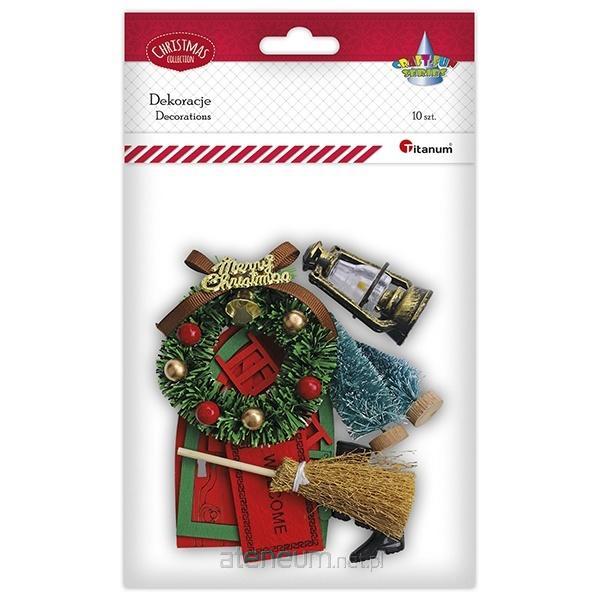 drzwi 66x100mm, miotła 100mm, drabina 20x60mm, okno 31x46mm, wycieraczka 35x54mm, wianek 75mm, choinki 25x48/28x65mm, lampa naftowa 37x55mm, para kaloszy 11x31x25mm