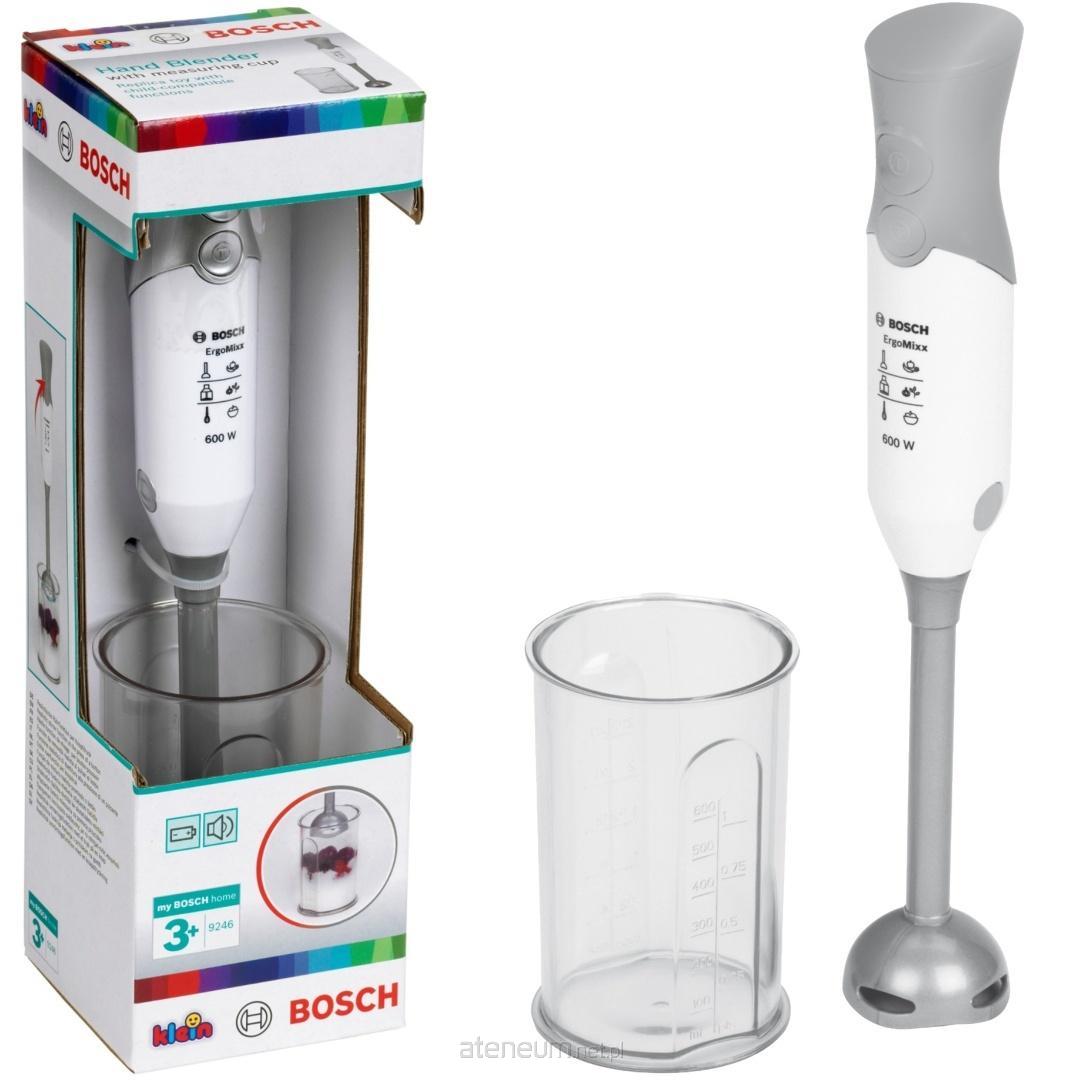 KL 9246 Blender Bosch z pojemnikiem srebrny Blender Klein powstał na licencji Bosch, dlatego też są wierną kopią prawdziwego urządzenia produkowanego przez tę firmę. Firma Klein od lat produkuje odpowiedniki prawdziwych narzędzi i akcesoriów AGD, przeznaczone do zabawy dla najmłodszych. Zestaw składa się z ręcznego blendera oraz przezroczystego pojemnika z miarką (250 ml). Blender jest kopią urządzenia marki Bosch i jak cała seria urządzeń AGD jest w kolorze srebrnym. Końcówka blendera obraca się po naciśnięciu guzika, a jego nasadkę mieszającą można zdjąć, co nadaje zabawie jeszcze większego realizmu. Ważną zaletą zabawki jest nie tylko jej pełna funkcjonalność, ale również gwarancja bezpieczeństwa, gdyż wszystkie elementy zostały wykonane z plastiku. Materiały, są najwyższej jakości, a także bezpieczne dla dziecka. Zabawka pozwoli każdemu dziecku na naśladowanie rodziców w sposób bezpieczny i pełen dobrej zabawy. Wielkość wszystkich elementów i akcesoriów zestawu jest dopasowana do potrzeb i rączek dziecka. Zabawka z pewnością będzie również świetnym uzupełnieniem pozostałych zestawów kuchennych firmy Klein. Specyfikacja: Produkt jest zabawką Zabawka przeznaczona dla dzieci powyżej 3 roku życia Waga : 0,3 kg Wymiary opakowania : 8x8x27 cm Ilość w opakowaniu zbiorczym : 6 Kraj pochodzenia : Chiny Seria zabawek AGD firmy KLEIN realistycznie odzwierciedla prawdziwe urządzenia wprowadzone na rynek przez najbardziej znane i jakościowo najlepsze marki produktów. Dla małych gospodyń domowych to niesamowita atrakcja! Dzieci z chęcią uczą się pomagać w wykonywaniu domowych czynności jednocześnie świetnie się przy tym bawiąc. Każdy ze sprzętów kuchennych pomoże w przygotowaniu zarówno małej przekąski jak i wykwintnego przyjęcia dla lalek lub koleżanek. Dodatkową zaletą tych zabawek jest to, że ich kolorystyka jest odpowiednia dla dziewczynek oraz dla chłopców.