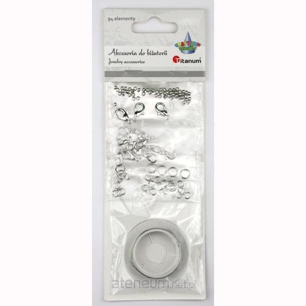 50 zacisków o2 mm, 3 zapięcia 14 mm, 10 zapięć 12 mm, 5 zapięć 10 mm, 5 ringów o6 mm, 20 ringów o5 mm, 1 drucik 3 m
