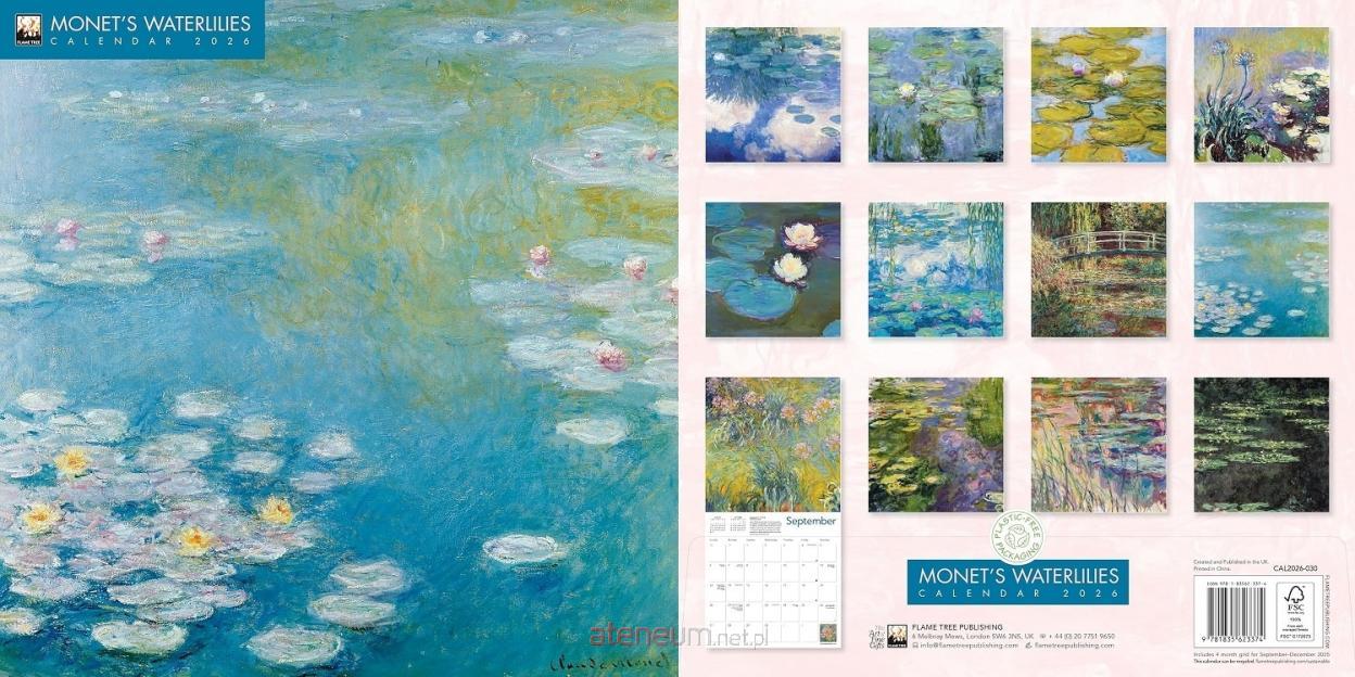 Kalendarz ścienny o wymiarach 300 300 mm, zatytułowany Monet's Waterlilies Wall Calendar 2026 (Art Calendar), wydany przez Flame Tree Publishing. Motywem przewodnim są słynne lilie wodne Claude'a Moneta - francuskiego mistrza impresjonizmu, który uchwycił zmienne światło, kolory i atmosferę swoich ogrodów wodnych w Giverny. Na każdej z 12 stron znajduje się jedno z jego najpiękniejszych dzieł, a poniżej umieszczono krótki opis przybliżający kontekst artystyczny i historię obrazu.