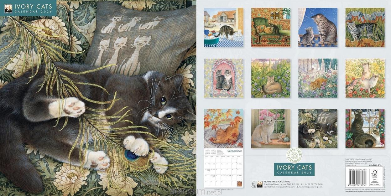 Kalendarz ścienny o wymiarach 300 300 mm, zatytułowany Ivory Cats by Lesley Anne Ivory Wall Calendar 2026 (Art Calendar), wydany przez Flame Tree Publishing. Motywem przewodnim są wyjątkowe ilustracje kotów autorstwa Lesley Anne Ivory, znanej z misternie dekorowanych scen z kotami na tle bogatych, ozdobnych kompozycji. Każda z 12 stron przedstawia jedno z jej uroczych dzieł, a poniżej znajduje się fragment poezji lub krótki opis podkreślający atmosferę ilustracji.