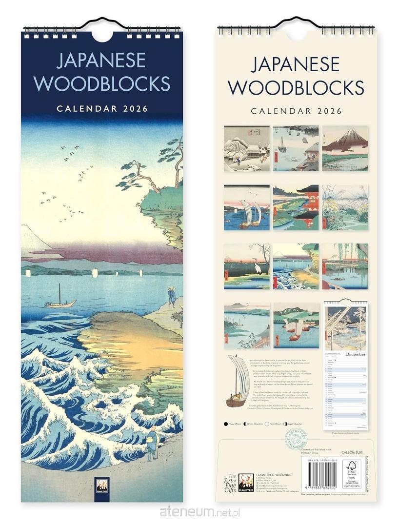Kalendarz ścienny w formacie 420145mm, zatytułowany Japanese Woodblocks Slim Calendar2026 (Art Calendar), wydany przez wydawnictwoFlameTree Publishing. Motywem przewodnim są klasyczne japońskie drzeworyty mistrzów takich jak UtagawaHiroshigeI iII, ukazujące pejzaże, góry, naturę i codzienne życie Japonii. Na każdej z 12 stron znajduje się jedno z tych dzieł, a poniżej zamieszczono krótki tekst wyjaśniający artystyczny i kulturowy kontekst pracy.