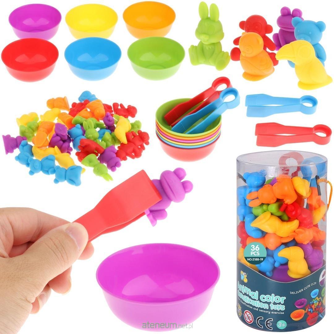 Zestaw zawiera kolorowe figurki zwierząt (królik, małpa, tukan/ptak, niedźwiedź) oraz pasujące do nich miseczki i szczypce. Zabawka doskonale ćwiczy motorykę małą oraz uczy logicznego sortowania.