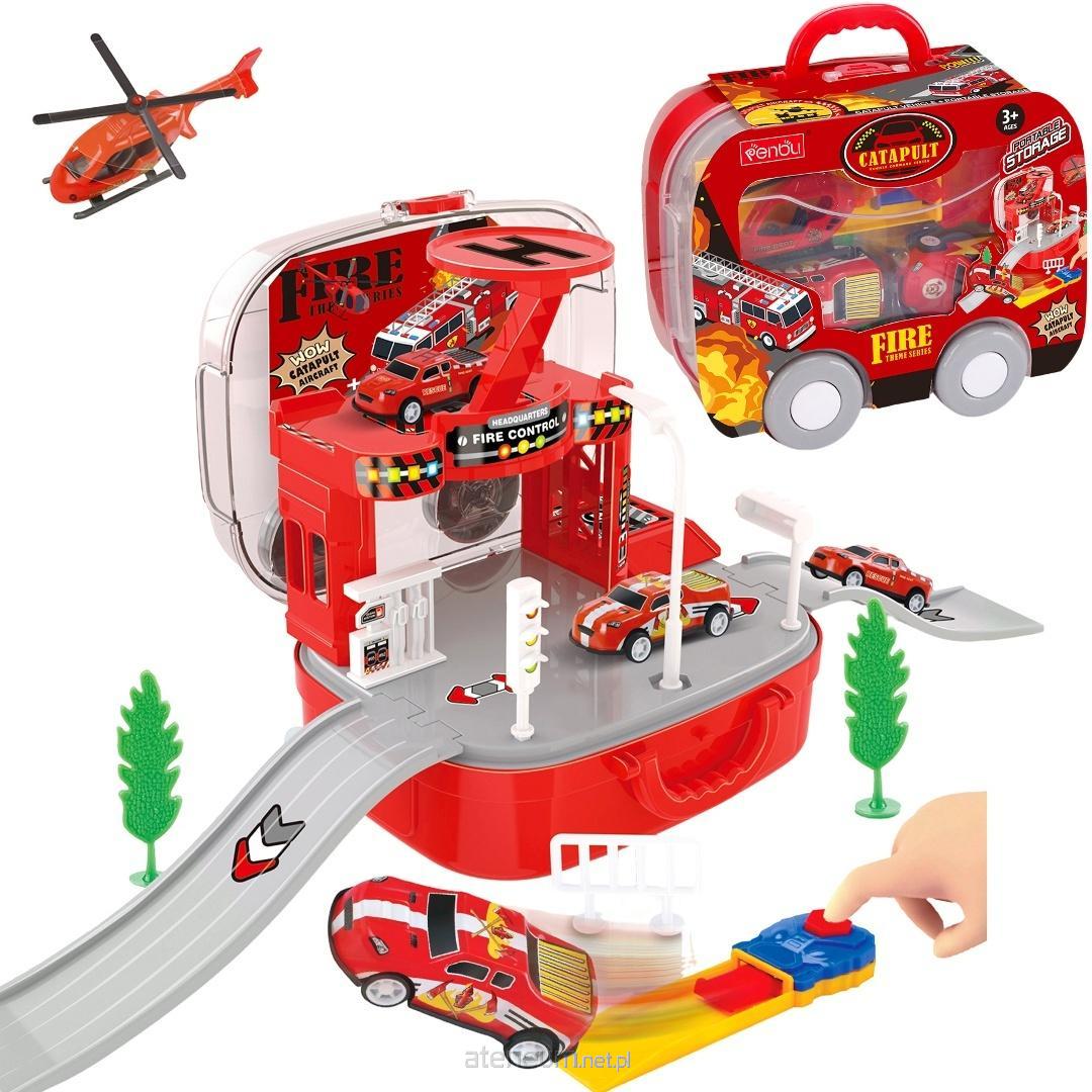 Zestaw zawiera: Walizkę (bazę), wozy strażackie, helikopter, wyrzutnię, elementy scenerii.