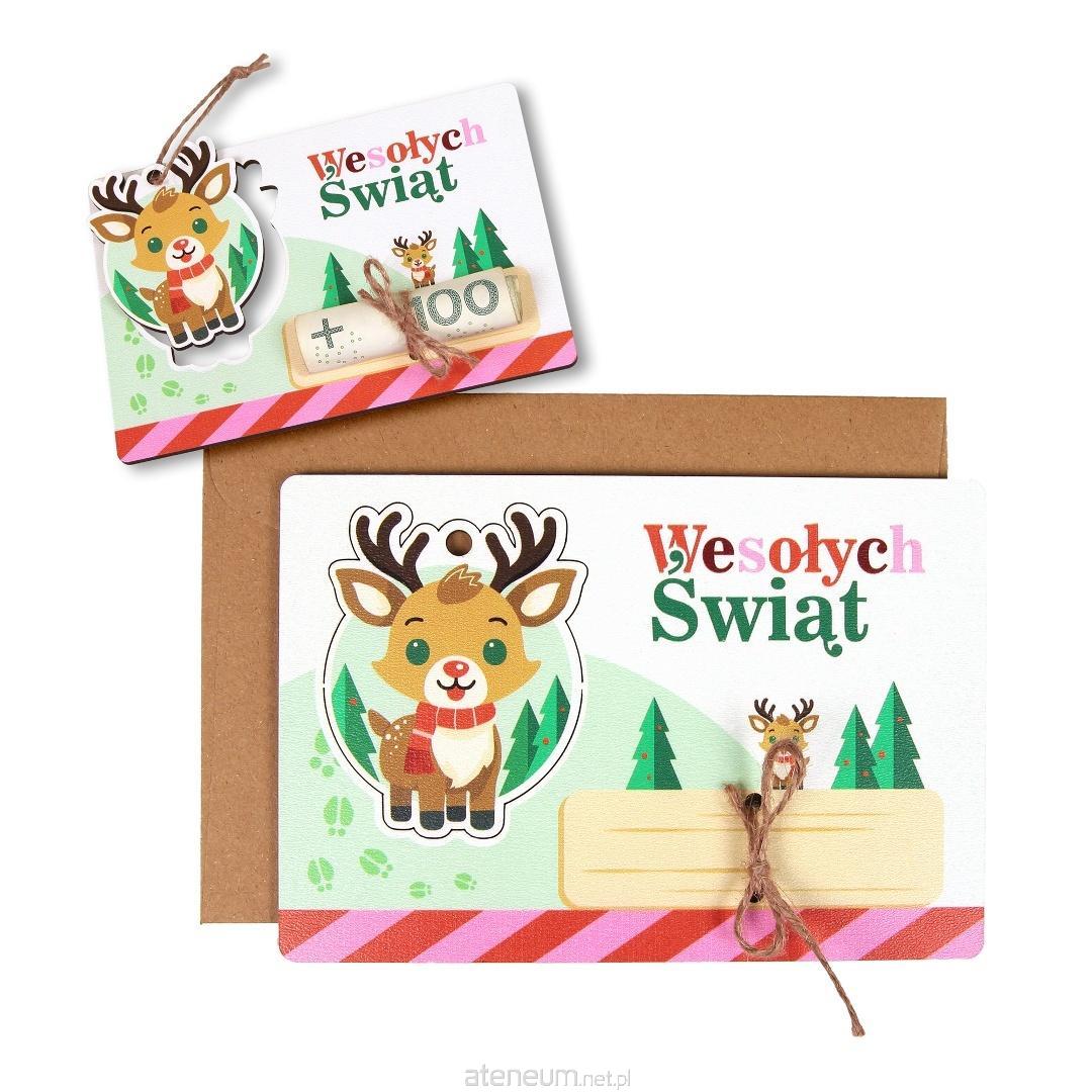 Drewniana kartka z kolorowym nadrukiem na Święta Bożego Narodzenia. Ciekawa alternatywa dla klasycznej kartki. Karnet zawiera dwa otwory wraz ze sznurkiem do przewiązania banknotu jako prezentu dla obdarowanej osoby. Dodatkowo jest laserowo wycięta bombka/zawieszka, którą wystarczy delikatnie wyłamać z kartki i może posłużyć jako dekoracja choinki.
