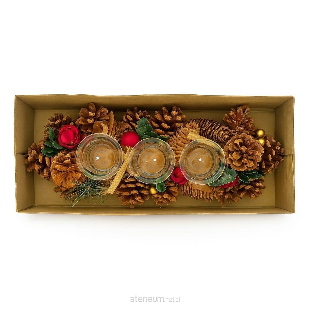 Elegancki stroik na Boże Narodzenie, o długości około 25-30cm. Nadaje się do położenia na świątecznym stole lub oknie. Naczynia w środku pozwalają na umieszczenie w nich trzech świec.