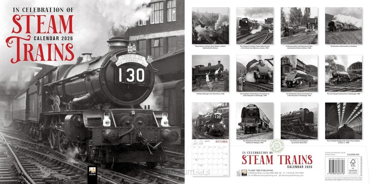 Kalendarz ścienny o wymiarach 300 300 mm, zatytułowany Steam Locomotives Wall Calendar 2026, wydany przez Flame Tree Publishing. Motywem przewodnim są imponujące ilustracje przedstawiające parowozy w pełnej krasie od majestatycznych lokomotyw parowych po klimatyczne sceny kolejowe, które przenoszą w złotą erę kolei.