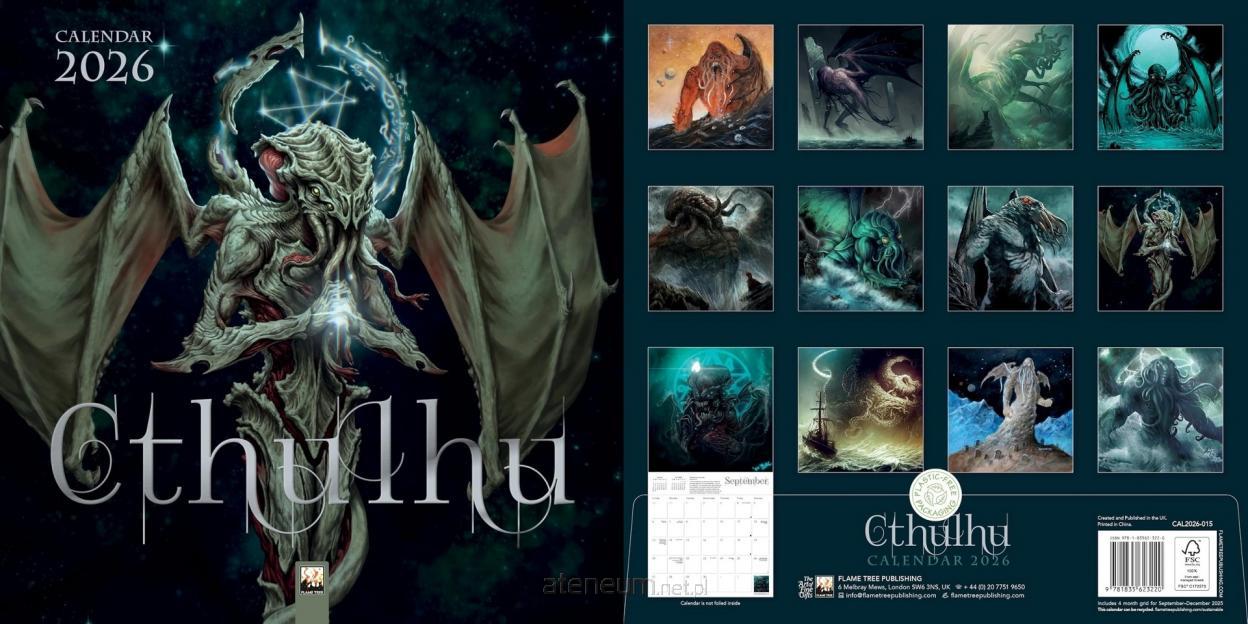 Kalendarz ścienny o wymiarach 300 300 mm, zatytułowany Cthulhu Wall Calendar 2026 (Art Calendar), wydany przez Flame Tree Publishing. Motywem przewodnim są mroczne i sugestywne ilustracje inspirowane twórczością H.P. Lovecrafta, które przenoszą w świat pradawnych kosmicznych tajemnic, potężnych bytów i niepokojącej atmosfery grozy. Każdy miesiąc zdobi osobna grafika przedstawiająca znane postaci i stworzenia z mitologii Cthulhu, ukazując ich monumentalność, surrealistyczny charakter i niepokojącą aurę.