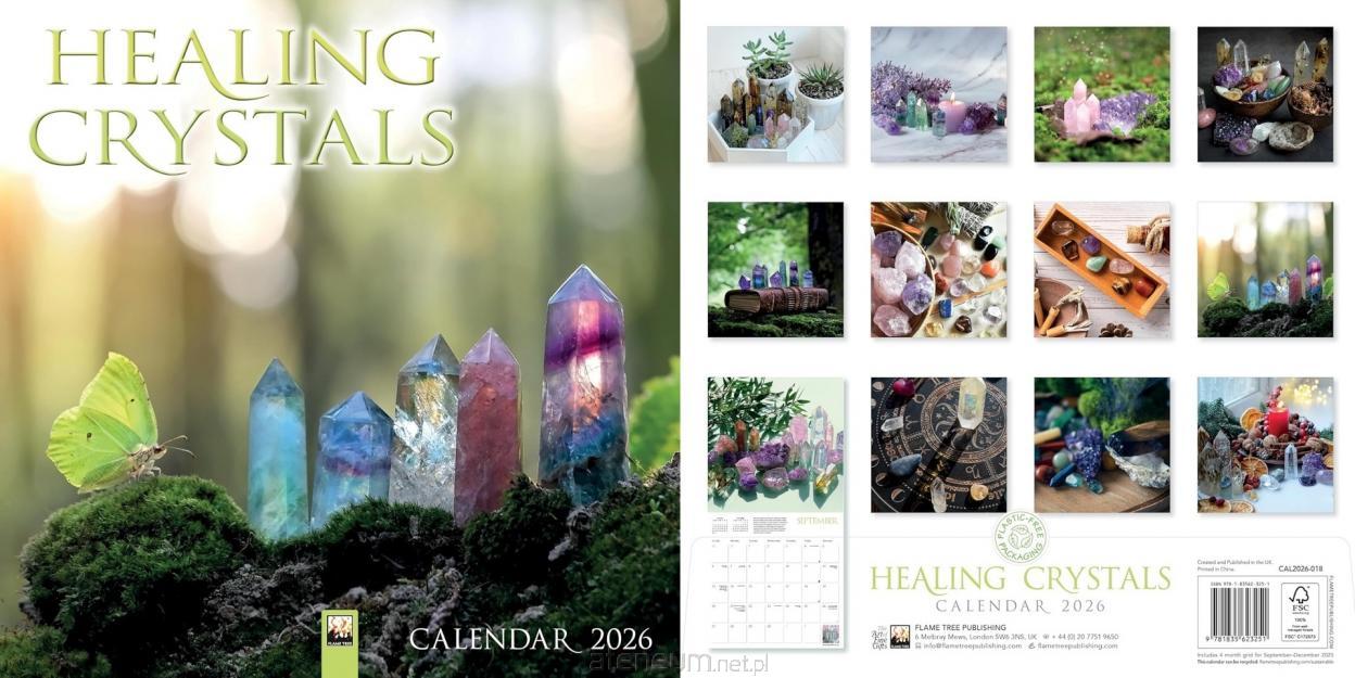 Kalendarz ścienny o wymiarach 300 300 mm, zatytułowany Crystals Wall Calendar 2026 (Art Calendar), wydany przez Flame Tree Publishing. Motywem przewodnim są zachwycające ilustracje przedstawiające kryształy ich geometryczne formy, lśniące struktury, subtelne refleksy światła i bogactwo kolorów, które przyciągają wzrok i pobudzają wyobraźnię.