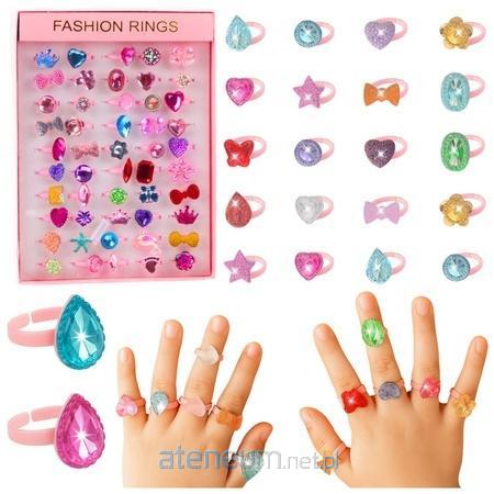W zestawie znajdują się różne wzory, takie jak serduszka, gwiazdki, korony, kwiatki, kokardki czy duże cyrkonie. Każdy pierścionek wykonano z lekkich, przyjemnych w dotyku materiałów, które pięknie odbijają światło, tworząc efekt kolorowych błyszczących kryształków. Produkt idealnie sprawdzi się podczas zabawy tematycznej, urodzin, przyjęć, jako nagrody w konkursach lub dodatek do prezentu.